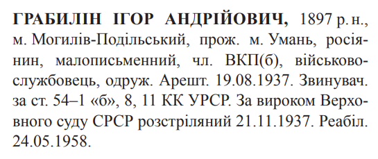 Ігор Грабілін розстріляний 21.11.1937 р.