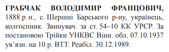 Реабілітований: Вінницьким облпрокурором 30.12.1989 Реабілітовані історією