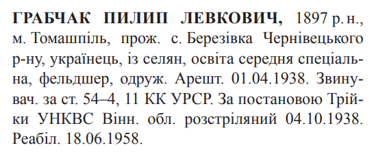Реабілітований: Вінницьким облсудом 18.06.1958 Реабілітовані історією