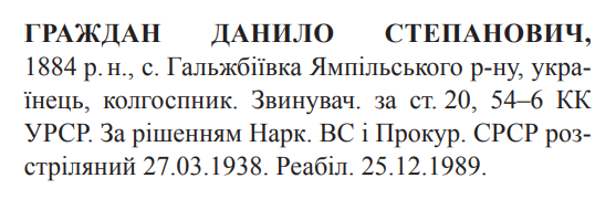 Данило Граждан розстріляний 27.03.1938