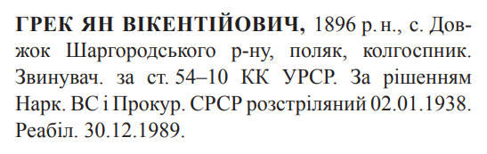 Соціальне походження: н/дОсвіта: н/дПартійність: позапартійнийПрофесія (місце роботи): колгоспникЗаарештований: н/дЗвинувачення: ст. 54-10 КК УССРНаркомом ВС і Прокурором СССР засуджений до розстрілуДата вироку: 26.12.1937 (протокол № 625)Ян Грек розстріляний в м. Вінниця 03.01.1938 р.Реабілітований: 30.12.1989
