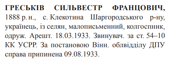 Учасник збройного опору російському большевизму.Потрапив до полону.Перебував на особливому обліку ГПУ.Заарештований: 18.03.1933Звинувачення: ст. 54-10 КК УССРВінницьким облвідділом ГПУ справу припиненоДата вироку: 09.08.1933
