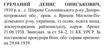 Реабілітований: Вінницькою облпрокуратурою 29.04.1939 Реабілітовані історією