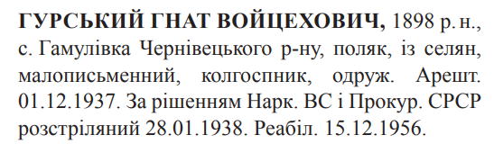 Соціальне походження: із селянОсвіта: малограмотнийПрофесія (місце роботи): колгоспникСімейний стан: одружений, 4 дітейЗаарештований: 01.12.1937Звинувачення: інформація відсутняНаркомом ВС і Прокурором СССР засуджений до розстрілуДата вироку: 03.01.1938 (протокол № 694)Гнат Гурський розстріляний в м. Могилів-Подільський 28.01.1938 р.Реабілітований: Верховним судом СССР 15.12.1956