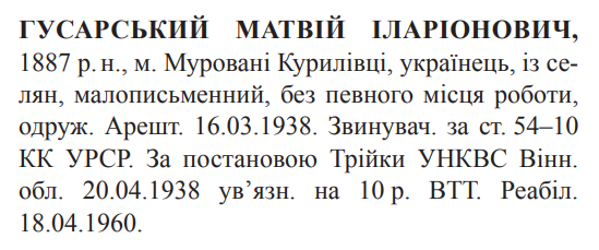 54-10 КК УССР. Трійкою УНКВС Вінницької обл. засуджений до 10 років ВТТ