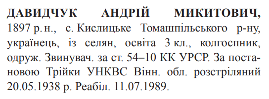 Реабілітований: Вінницьким облпрокурором 11.07.1989