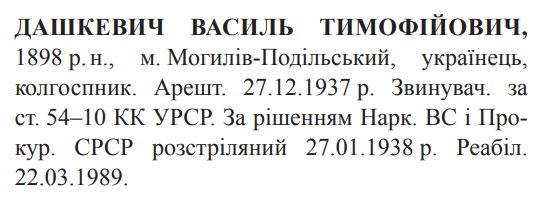 Василь Дашкевич розстріляний 27.01.1938