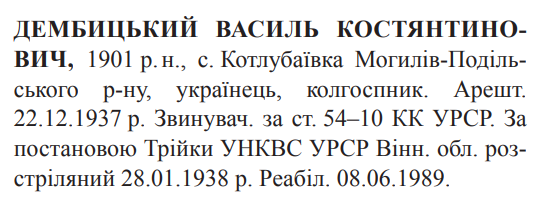 Василь Дембицький розстріляний 28.01.1938