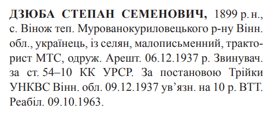 54-10 КК УССР. Трійкою УНКВС Вінницької обл. засуджений до 10 років ВТТ