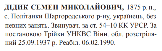 Семен Дідик розстріляний 25.09.1937