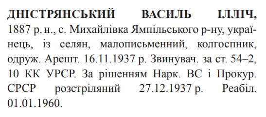 Василь Ілліч Дністрянський розстріляний 27.12.1937