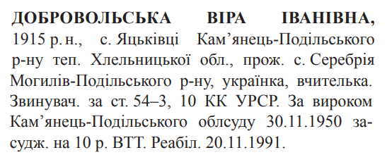 54-3, 54-10 КК УССР. Кам'янець-Подільським обласним судом засуджена до 10 років ВТТ
