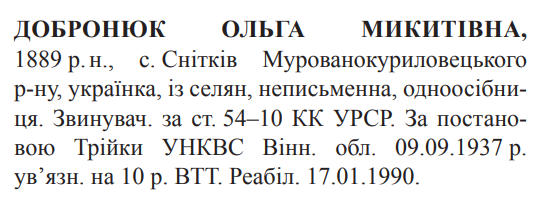 54-10 КК УССР. Трійкою УНКВД Вінницької обл. засуджена до 10 років ВТТ