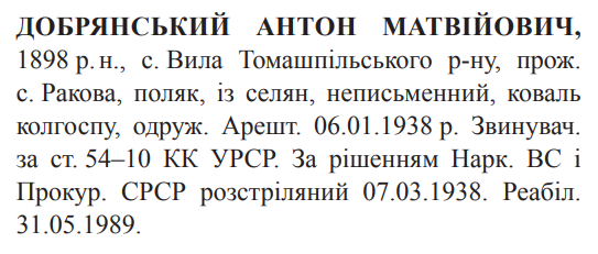 Реабілітований: Вінницьким облпрокурором 31.05.1989 Реабілітовані історією