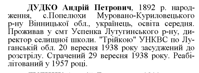 Учасник збройного опору російському большевизму.Потрапив до полону.На особливому обліку ГПУ з 1923 р.Заарештований: н/дЗвинувачення: н/дТрійкою УНКВД Луганської обл. засуджений до розстрілуДата вироку: 20.09.1938Андрій Дудко розстріляний 29.09.1938 р.Реабілітований: 1957 р.