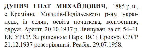 Гнат Дунич розстріляний 21.12.1937