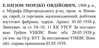 Соціальне походження: з торговцівОсвіта: малописьменнийПрофесія (місце роботи): робітник взуттївої фабрикиСімейний стан: одружений, 2 дітейЗаарештований: 01.05.1938.Звинувачення: 54-10, 54-11 КК УССРТрійкою УНКВД Вінницької обл. засуджений до 10 років ВТТДата вироку: 20.05.1938Реабілітований: НКВД Вінницької обл. 03.05.1939