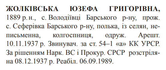 Юзефа Жолкевська розстріляна 08.12.1937