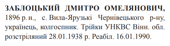 Дмитро Заблоцький розстріляний 28.01.1938