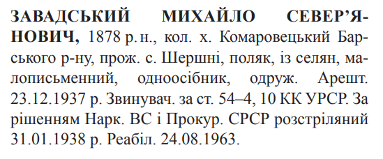 Михайло Завадський розстріляний 31.01.1938