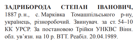Реабілітований: Вінницькою облпрокуратурою 20.04.1989 Реабілітовані історією