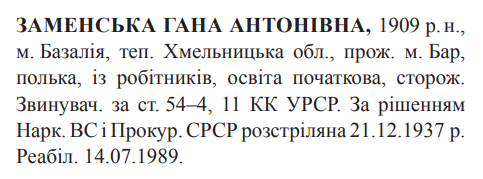 Ганна Заменська розстріляна 21.12.1937