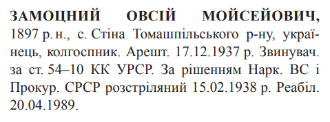 Соціальне походження: н/дОсвіта: н/дПрофесія (місце роботи): колгоспникЗаарештований: 17.12.1937Звинувачення: ст. 54-10 КК УССРНаркомом ВС і Прокурором СССР засуджений до розстрілуДата вироку: 16.01.1938Овсій Замоцний розстріляний у Вінниці 16.02.1938 р.Реабілітований: Вінницькою облпрокуратурою 20.04.1989(Можливий варіант написання: Замоцний Євсей)