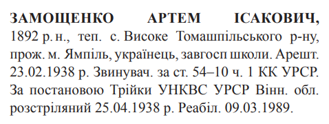 Учасник збройного опору російському большевизму в 1918-20 рр.Потрапив до полону.На особливому обліку Ямпільського ЧК-ГПУ з 1920 р.Заарештований: 23.02.1938Звинувачення: ст. 54-10 ч.1 КК УССРТрійкою УНКВД Вінницької обл. засуджений до розстрілуДата вироку: 05.04.1938Артем Замощенко розстріляний 25.04.1938 р.Реабілітований: Вінницькою облпрокуратурою 09.03.1989