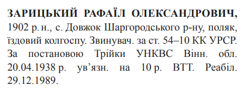 54-10 КК УССР. Трійкою УНКВС Вінницької обл. засуджений до 10 років ВТТ