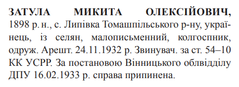 54-10 КК УССР. Вінницьким обласним відділом ДПУ справу припинено