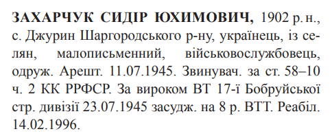 58-10 ч.2 КК РСФСР. ВТ 17-ї Бобруйської стр.дивізії засуджений до 8 років ВТТ з поразкою в правах на 3 роки