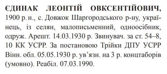 54-8, 54-10 КК УССР. Трійкою УНКВС Вінницької обл. засуджений до 3 років таборів (умовно)