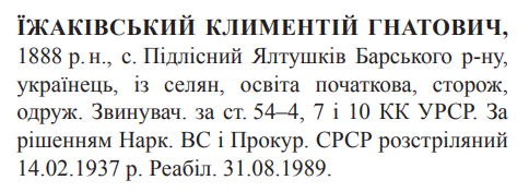 Соціальне походження: із селянОсвіта: початковаПрофесія (місце роботи): сторожСімейний стан: одружений, 2 дітейЗаарештований: н/дЗвинувачення: ст. 54-4, 54-7, 54-10 КК УССРНаркомом ВС і Прокурором СССР засуджений до розстрілуДата вироку: 09.12.1937 (протокол № 497)Калень Іжаківський розстріляний в м. Вінниця 15.12.1937 р.Реабілітований: Вінницьким облпрокурором 31.08.1989(Можливі варіанти написання прізвища: Їжаковський, Їжаківський, Іжаковський)