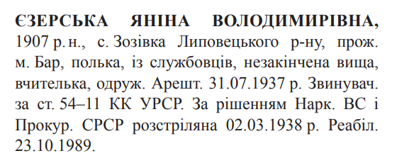 Яніна Єзерська розстріляна в м. Вінниця 03.03.1938