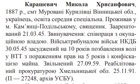 Реабілітований: Прокуратурою Хмельницької обл. 25.11.1991 р. Реабілітовані історією