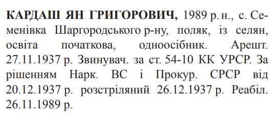 Ян Кардаш розстріляний 26.12.1937