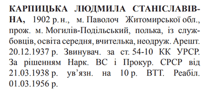(Можливі варіанти написання прізвища: Карпіцька, Карпинська, Карпінська) Реабілітовані історією