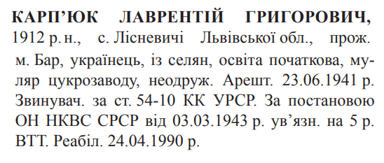 Реабілітований: Вінницькою облпрокуратурою 24.04.1990 Реабілітовані історією