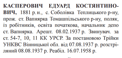 Едуард Касперович розстріляний 08.08.1937