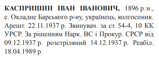 Соціальне походження: н/дОсвіта: н/дПрофесія (місце роботи): колгоспникЗаарештований: 22.11.1937Звинувачення: ст. 54-4, 54-10 КК УССРНаркомом ВС і Прокурором СССР засуджений до розстрілуДата вироку: 09.12.1937Іван Каспришин розстріляний 15.12.1937 р. в м. ВінницяРеабілітований: Вінницькою облпрокуратурою 18.04.1989(Можливі варіанти написання: Каспришен, Ян Янович)