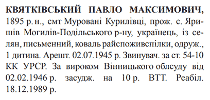 54-10 КК УССР. Вінницьким облсудом засуджений до 10 років ВТТ