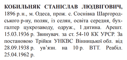 54-10 КК УССР. Трійкою УНКВС Вінницької обл. засуджений до 10 років ВТТ