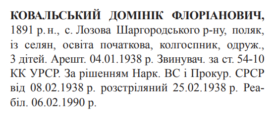 Соціальне походження: із селянОсвіта: н/дПартійність: б/пПрофесія (місце роботи): бригадир, колгосп "Прогрес", с. ЛозоваСімейний стан: одружений, троє дітейВ 1918 р. служив у гетьманській державній варті, в 1919 р. служив у міліції УНР.Заарештований: 04.01.1938 Шаргородським райвідділом НКВДЗвинувачення: ст. 54-10 ч.1 КК УССР (закликав не працювати в колгоспі)Наркомом ВС і Прокурором СССР засуджений до розстрілуДата вироку: 08.02.1938 (протокол № 919)Домінік Ковальський розстріляний в м. Вінниця 26.02.1938 р.Реабілітований: Вінницькою облпрокуратурою 06.02.1990 р.