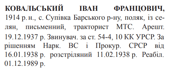Соціальне походження: н/дОсвіта: н/дПрофесія (місце роботи): тракторист МТСЗаарештований: н/дЗвинувачення: ст. 54-4, 54-10 КК УССРНаркомом ВС і Прокурором СССР засуджений до розстрілуДата вироку: 16.01.1938Іван Ковальський розстріляний 12.02.1938 р. в м. ВінницяРеабілітований: Вінницькою облпрокуратурою 01.12.1989