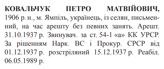 Петро Ковальчук розстріляний 15.12.1937