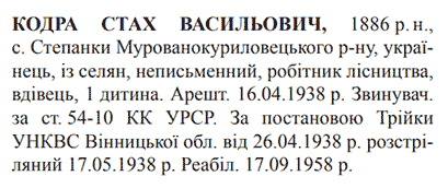 Реабілітований: Вінницьким облсудом 17.09.1958 Реабілітовані історією