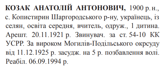 Реабілітований: Вінницьким облпрокурором 06.09.1994 Реабілітовані історією
