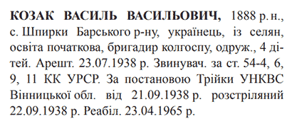 Василь Козак розстріляний 22.09.1938