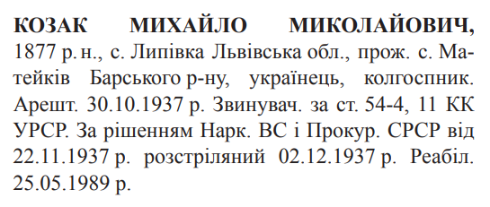 Реабілітований: Вінницькою облпрокуратурою 25.05.1989 Реабілітовані історією