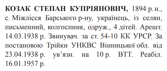 54-10 КК УССР. Трійкою УНКВС Вінницької обл. засуджений до 10 років ВТТ